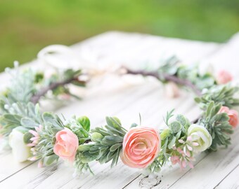 Pastel peach pink white flower crown, bridal hairpiece, wildflower crown, pink hair wreath, rustic flower crown, pink flower crown