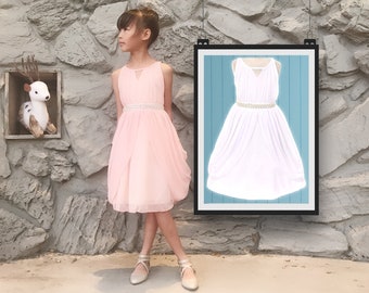Little to Big Girl Rhinestone Pearl Chiffon Draped Dress, Blush Pink, White, Baptism, Christening, Wedding Flower Girl, Easter, Size 2-14