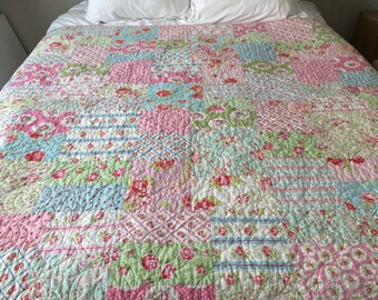 Quilt Twin Size Shabby Decor Floral Aqua Light Blue Pink White Green Tanya Whelan Fabric with Roses Blanket Throw MADE TO ORDER