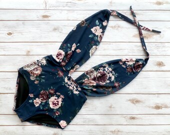 Swimsuit One Piece High Waisted Vintage Style Retro Pin-up Maillot - Navy Blue Pink White Cream Floral Print Plunge Bathing Suit Swimwear