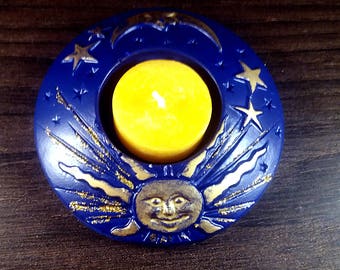 Tea light holder Sun and moon, Day and night, Night blue and gold. With tea light from beeswax
