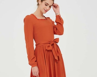 orange linen dress, prom wedding dress, tie belt dress, party dress, long sleeves dress, romantic dress, womens dresses, linen clothing 2105