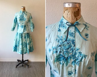 Rosamonde 50s dress | Vintage tiffany blue chintz circle skirt and shirt | 1950s floral print belted suit rhinestone buttons