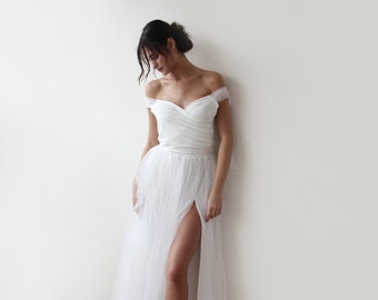 Wrap style wedding dress, Off-The-Shoulder Thin Straps, Dots tulle wedding gown, Tulle skirt with Slit, Sexy Ivory Dress , 1194