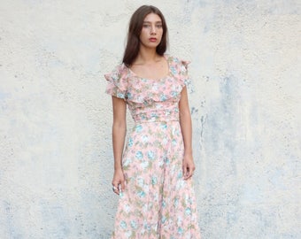 INCREDIBLE Floral Print Ruffle Sleeve 50s Light Pink Maxi Dress Handmade Medium