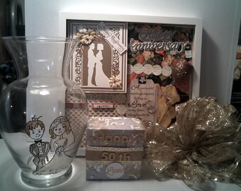 HAPPY 50TH ANNIVERSARY Picture Frame Golden Anniversary Shadow Box with Wedding Couple Glass Vase And 50th Anniversary Gift Box Great Gift