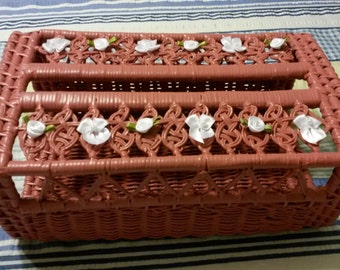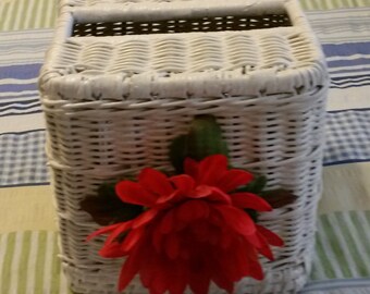 Tissue Box Cover UpCycled Cottage Chic Vintage White Wicker Small With Large Red Flower Home Decor Country Decor Bath Decor Gift Idea Unique