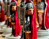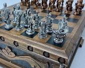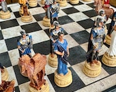 5 out of 5 starsThis is a very attractive and colorful chess set that specifically depicts the Greek, Trojan War. All of the pieces are meticulously crafted and painted to resemble those ancient warriors of centuries ago. Also accompanying the chess pieces is a beautiful chess board that was created like a box with the board on top, and the chess pieces are carefully stored inside. This is a very handsome chess set that has museum quality. It was shipped to me in a timely manner, and was well-wrapped securely. I would highly recommend this company for future purchases, and I would be happy to buy an item from them again. Peter Appel.