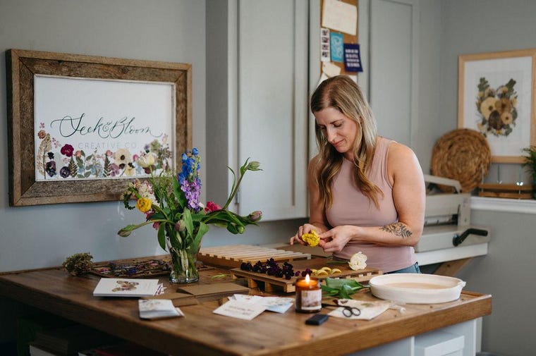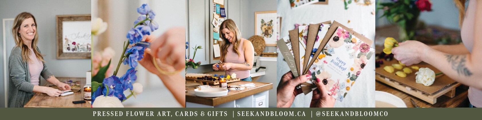 I’m Ashley, the artist behind Seek & Bloom. I press and preserve flowers to create meaningful, lasting artwork and stationery that speaks to your memories, favourite places, and heartfelt emotions. With a lifelong background in art & design and love of nature, my work has become more than a creative outlet, it’s a lifestyle. It’s a way to slow down, pay attention, and honour a beauty that’s often overlooked.