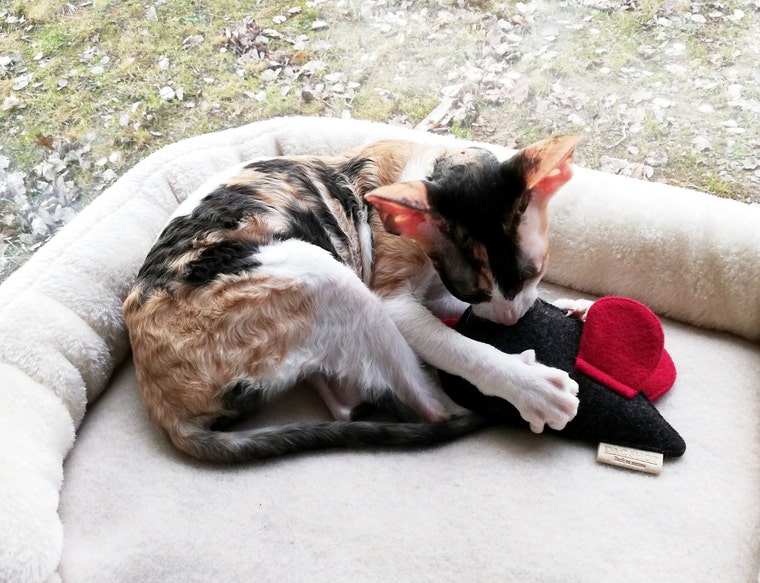My kitten play with wool mouse and checking quality.