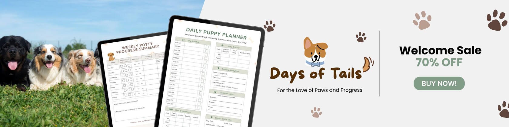 That’s why I created Days of Tails — a collection of gentle, structured resources made with both dogs and their humans in mind. From potty logs to behavior trackers, every tool is designed to bring calm to the chaos, make training manageable, and help you feel confident in caring for your pup.