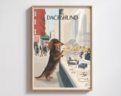 The illustrations are richly detailed and specific, a Golden Retriever on a Parisian boulevard, a Corgi surrounded by books in a London library, a Dachshund on 5th Avenue who owns the pavement entirely. Each breed has a character. Each print is a portrait of that character.