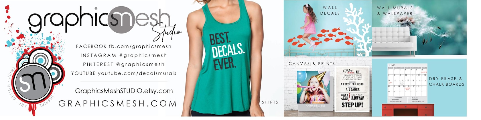 Graphics Mesh (formally known as Decals Murals) is a small design studio with many capabilities, love for the craft, and large ambitions. This store is a result of experience + serendipity + imagination and it all started with these bird cages http://etsy.me/TcTDup, which are still in my bathroom in white on a black wall. We specialize in modern interior wall decorations such as wall decals, custom canvas prints and dry erase calendars and boards. Anything in the store can be customized so don't be shy!