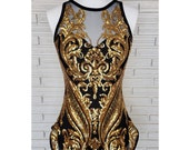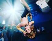 5 out of 5 starsI cannot recommend this costume enough! I was on the fence about it for a while, I don’t usually like one piece costumes, but I decided to take the chance bc I love harmony threads and I hoped with the cutout in front, I didn’t need to worry about my long torso pulling the costume into an unflattering position or accidentally exposing myself. First, the pictures don’t do this piece justice, it’s absolutely gorgeous! I tried it on as soon as I received it and I was correct that the cutout allows the costume and my body to move freely without risking exposure, wedgie, or cameltoe. It immediately became my favorite costume. I am currently injured, so I unfortunately don’t have a pic of me performing in it yet, and Etsy only allows you to post a review so long after purchase, so please excuse my low quality bathroom pic.