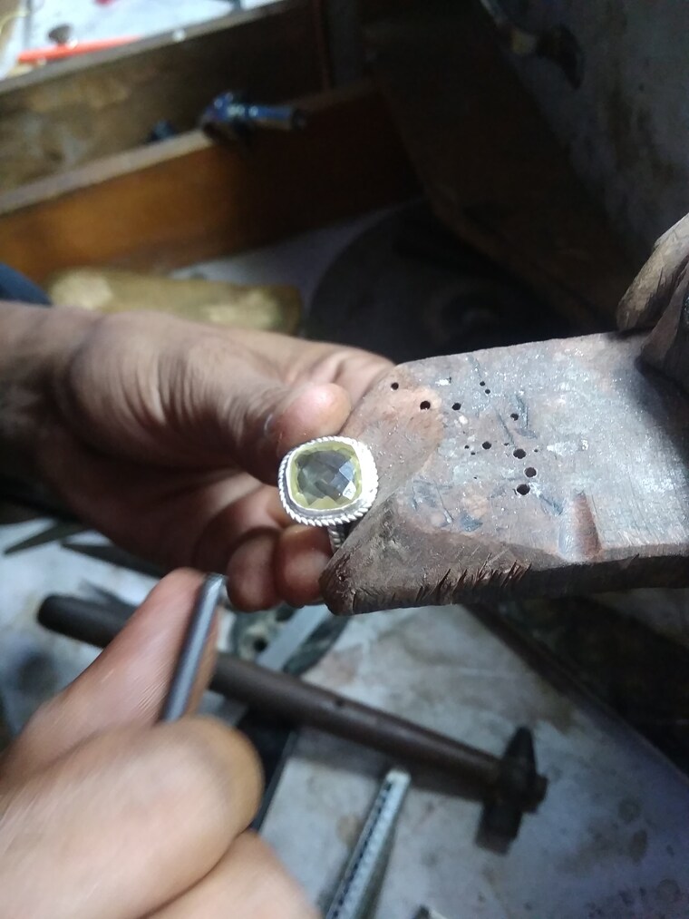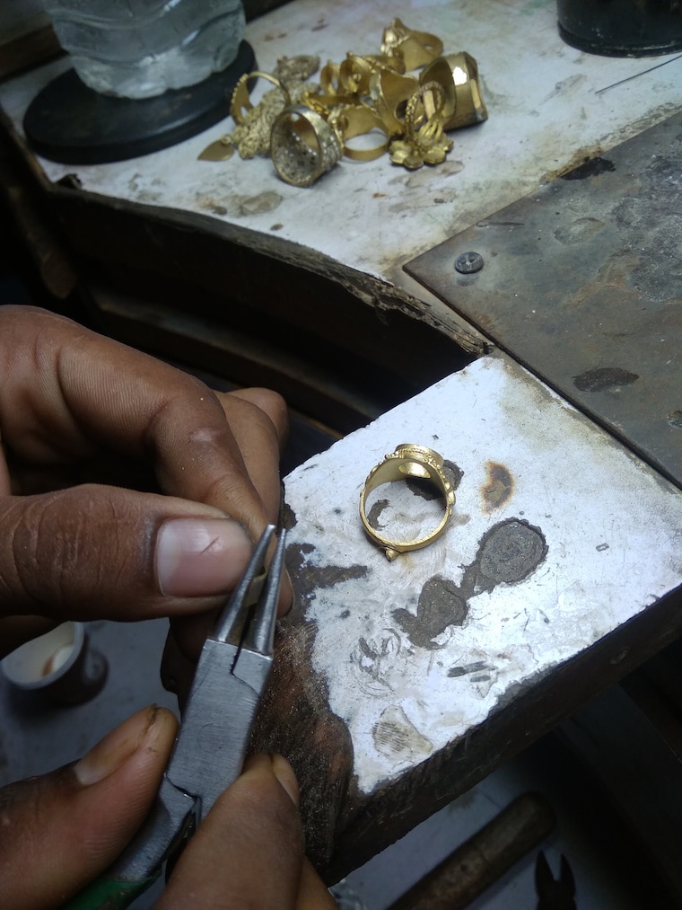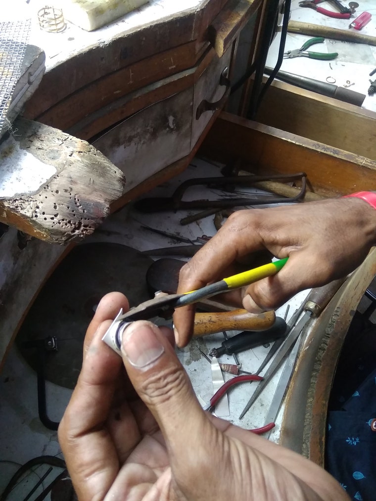 Work in Progress: A close-up of you soldering, polishing, or stone setting Tools like pliers, hammers, wax molds, engr -