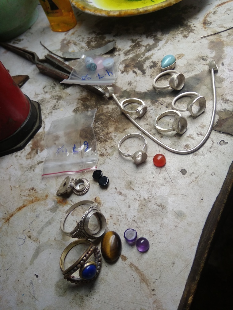 Raw gemstones, brass sheets, silver wires, or gold plating before creation Neatly arranged tools or trays of stones and -