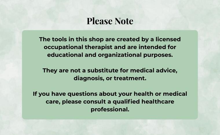 Each product—whether it’s a brain dump, a therapy planner, or a symptom log—is created to reduce overwhelm, promote clarity, and support consistency in everyday life. Everything in this shop is grounded in real-world use, clinical insight, and the belief that function and meaning go hand-in-hand.