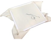 Punch needle project in an embroidery hoop with primary rug backing fabric. -