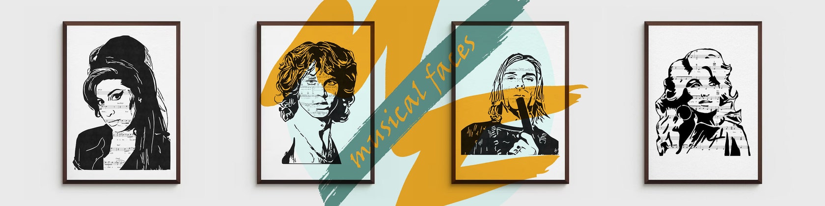 "Musical Faces was born in the heart of lockdown, where I hand-inked silhouette portraits of iconic musicians, starting with a personalized gift for my dad—a John Lennon portrait featuring the musical notation of 'Imagine.' Encouraged by the rave reviews from friends and family, I continued creating, crafting Dolly Parton for a friend, and completing the set with the other three Beatles for subsequent celebrations. Fueled by the passion and excitement of those around me, I founded 'Musical Faces,' bringing the fusion of legendary silhouettes and musical notation to life for all to cherish."