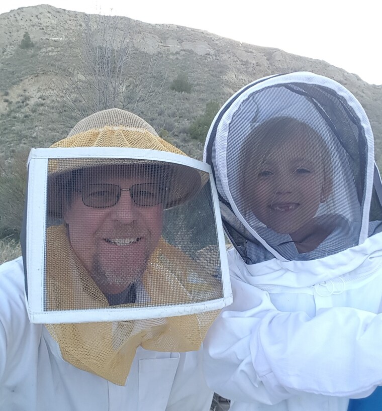 Mark and his little helper Sofia checking on the Bees. -