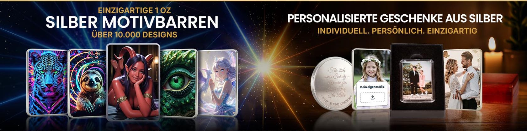 Neben unserer eigenen Designserie bieten wir auch vollständig personalisierte Silberbarren und Silbermünzen an. Diese können mit persönlichen Fotos, individuellen Motiven und Gravuren individuell gestaltet werden und ergeben so einzigartige Silberstücke von emotionalem und bleibendem Wert. Ob als Sammlerstück, Geschenk oder besonderes Erinnerungsstück – jedes Stück wird mit persönlicher Bedeutung gefertigt.