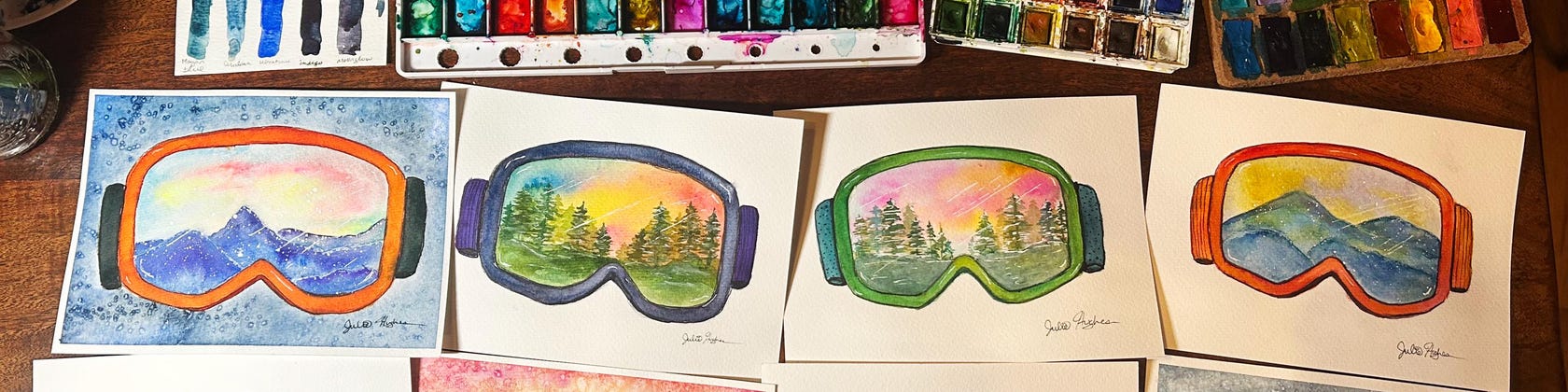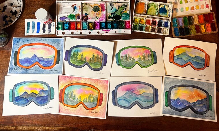 Goggle series in progress. All hand painted with watercolors and pen.