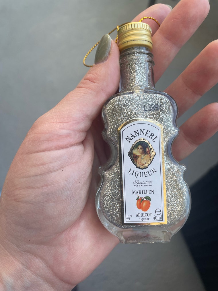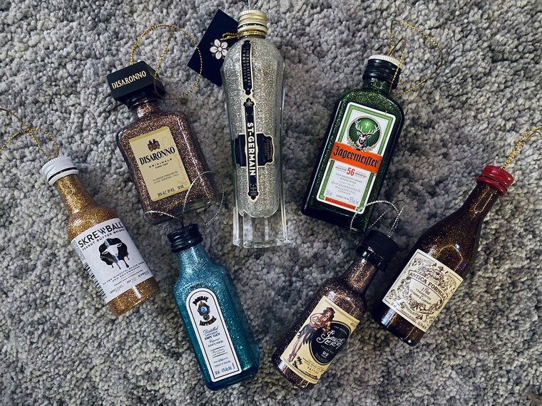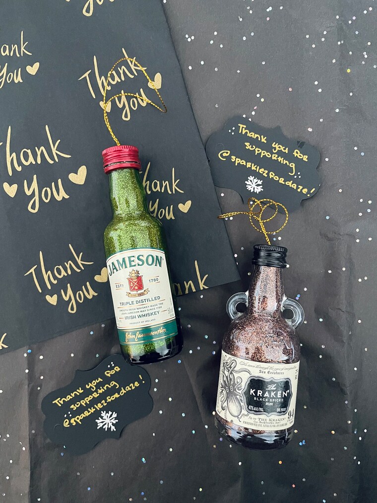 I have always loved anything sparkly (I guess that's the Pisces in me?) and let's be honest... mini alcohol bottles are just adorable. I enjoy making these dazzling holiday ornaments and I hope you enjoy seeing them! Thank you for looking! -V