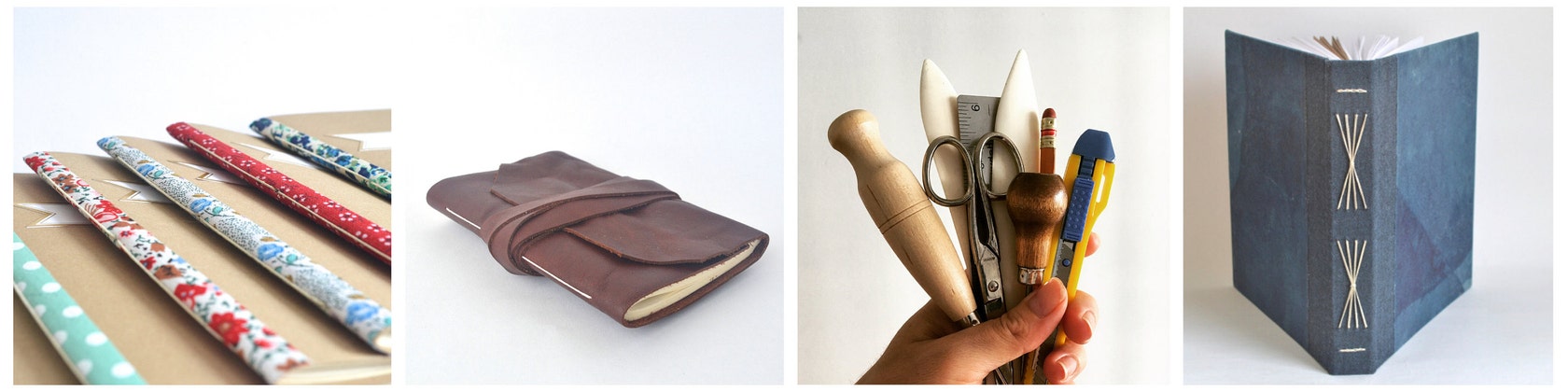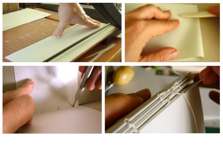 Cutting paper, folding pages, punching holes to hand sew with beeswaxed linen thread. Books made by hand, with love. -
