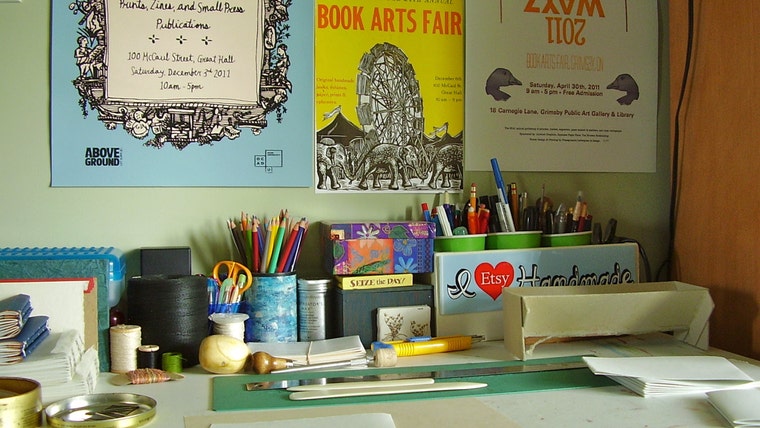 The studio with a few hand tools and prints of my favourite Book Arts Fairs! -