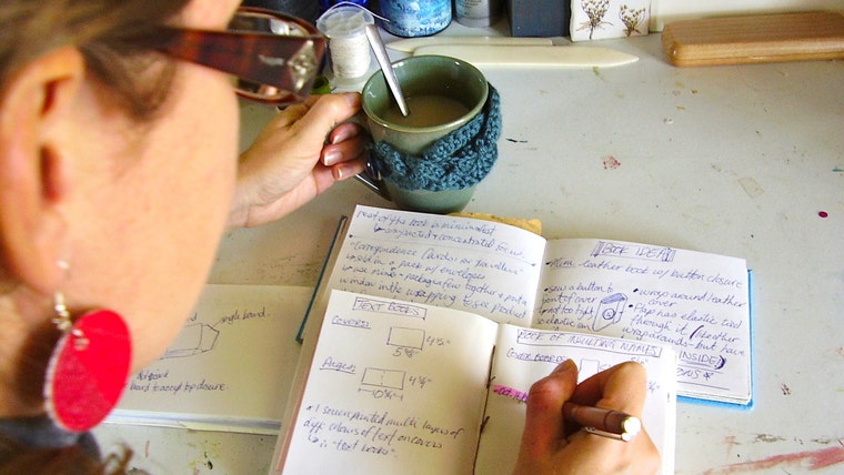 Brainstorming new products: cup of tea, sketchbooks with ideas, fancy pen, sunshine. It's all here!