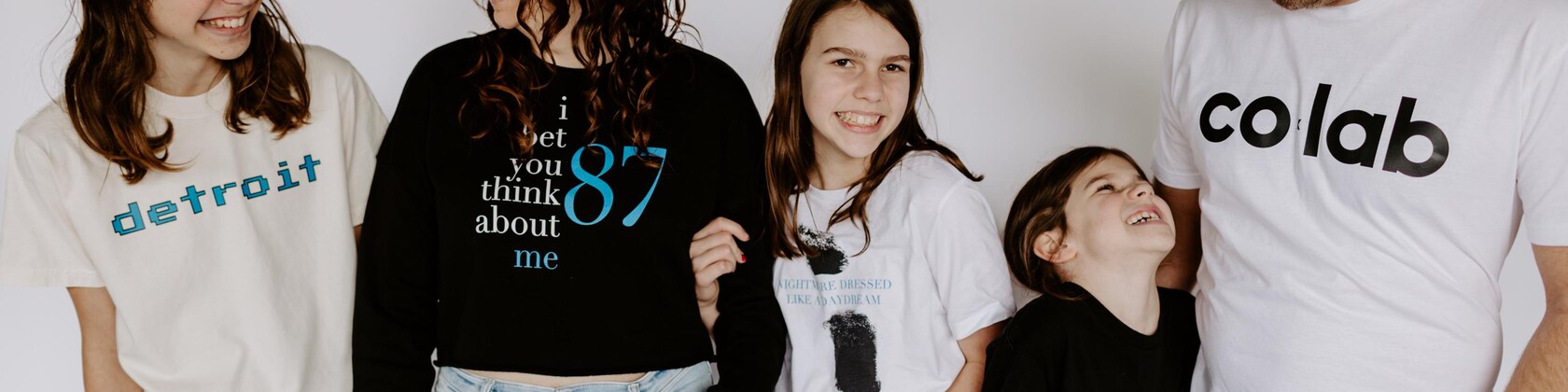 E tudo isso levou à ideia... e se tivéssemos algumas camisas que misturassem esses gêneros? E se pudéssemos ter camisas que mostrassem nosso amor por Taylor Swift, mas não nos obrigassem a comprar roupas dos Chiefs. Uma ideia se tornou alguns mockups de designs no computador. Alguns mockups no computador se tornaram camisetas de amostra. E eventualmente decidimos fazer um experimento de educação domiciliar, transformando-o em um negócio familiar com um objetivo simples: vender camisas suficientes para comprar ingressos para um jogo dos Lions.