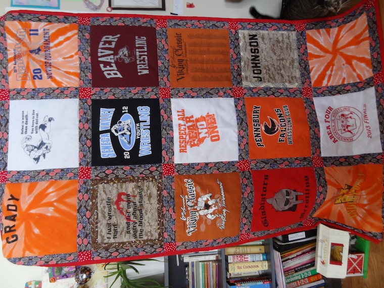 I am often found hiding behind my custom t-shirt quilts. -