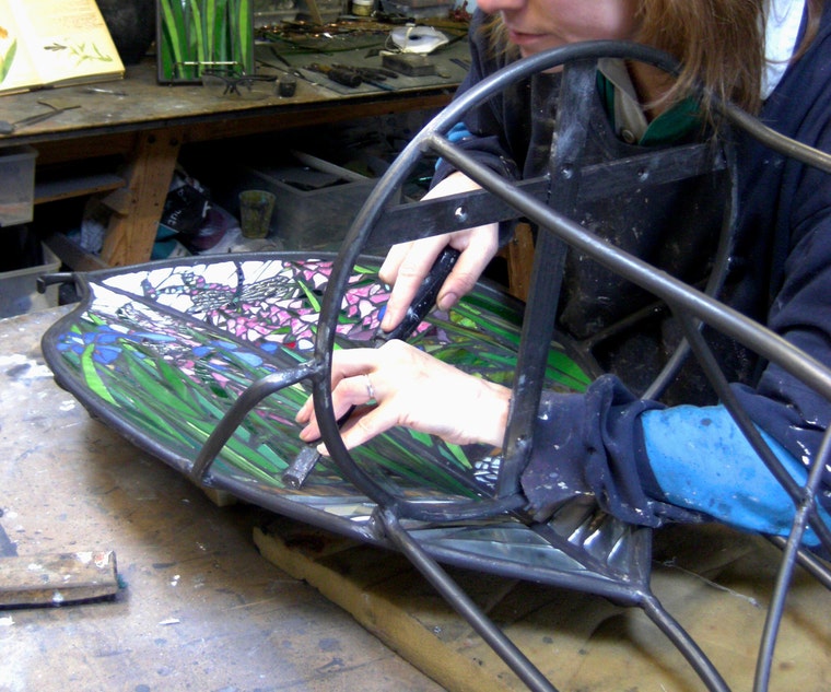 Willa specializes in artwork which combines stained glass and mosaic techniques to produce a fusion of bold designs with a traditional flavor. Her company, ‘Unique In Glass’, handcrafts large and small scale, one-off designs for abstract art pieces, mirrors, fire screens, panels, furniture, windows, doors and sculpture. Designs characteristically feature hand cut stained glass combined with wood, shell, gem stones or metal.