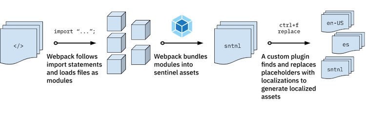 We tried this placeholder loader approach, and as long as it returned syntactically valid JavaScript, Webpack could continue with no issue and generate assets containing these placeholders, which we call “sentinel assets”. Later on in the build process a custom plugin takes each sentinel asset, finds the placeholders, and replaces them with corresponding message catalogs to generate a localized asset.