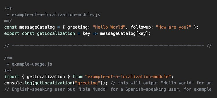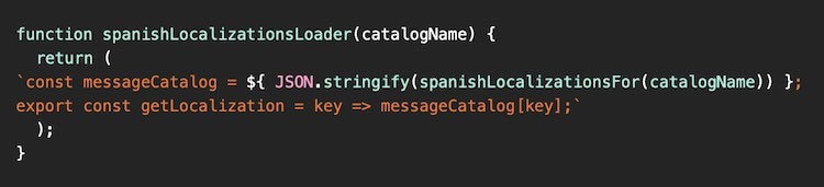 For a different locale, the message catalog contains analogous localization strings for the locale. We programmatically handle generating analogous message catalogs with a custom Webpack loader that applies whenever Webpack encounters an import for localizations. If we wanted to build Spanish assets, for example, the loader would look something like this: