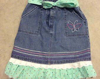 Upcycled denim skirt, girls size 4, ruffle jeans skirt, recycled skirt wih frill, aqua blue