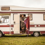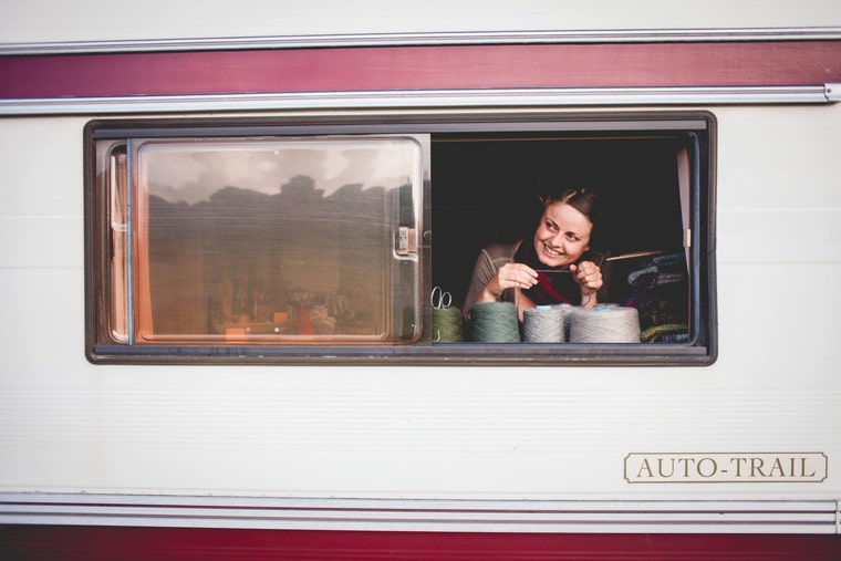 Cutting a weaving off the loom in my motorhome workshop: shaking it free for the first full view of the newborn!