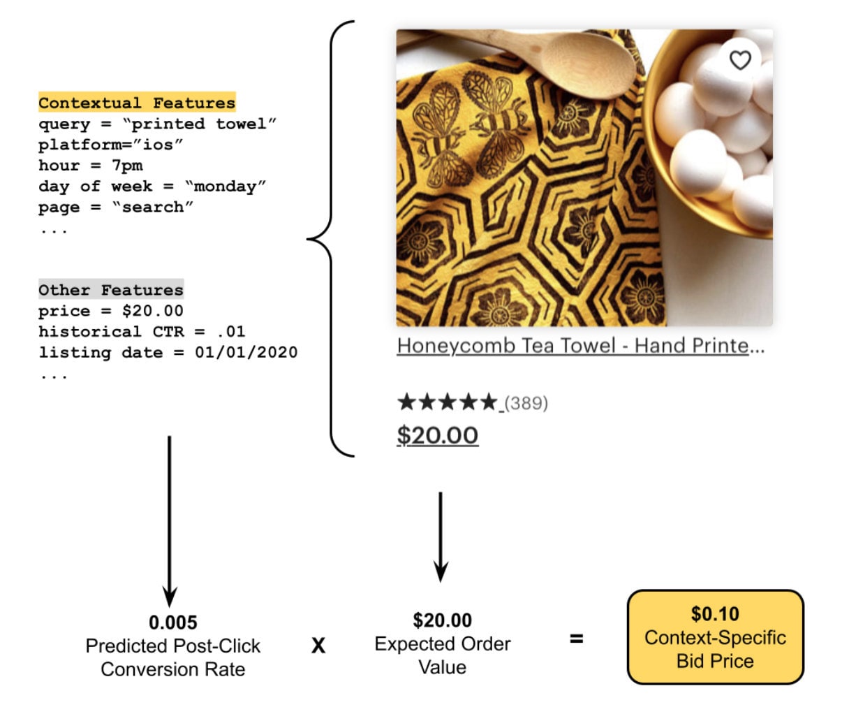 Example of a context-specific bid for a “printed towel” search on an iOS device. This listing matched the query, and given its inputs our model predicts that 5 of 1000 clicks should lead to a purchase. With an expected order value of $20, the bid should be around $0.10. The adaptive bid price helps sellers win high purchase-intent traffic and saves budget on low purchase-intent traffic.
