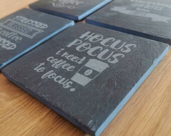 4 Engraved Coasters | Slate | Quotes | Coffee | handmade coasters | Coasterset | Table decoration