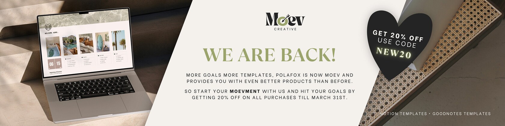 At Moev Creative, our mission is to help you become the best version of yourself. We do this by providing minimal, functional, and thoughtfully-designed templates and prints that keep you motivated, organized, and inspired.