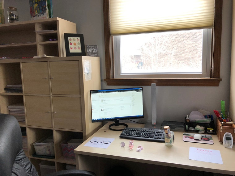 Where the magic happens :-) My happy space, with baby monitor, snow view, and my supplies ready to use. PaperLine Art -
