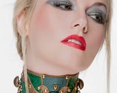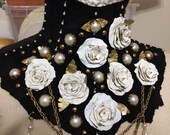 ALLE meine Stücke sind komplett von Hand gemacht. Handnähte auch! Die meisten Stücke sind maßgeschneidert, um perfekt zu passen. Die meisten Stücke sind auch in anderen Farbkombinationen erhältlich.... Fragen Sie einfach. Ich mache auch kundenspezifische Bestellungen, aber benutzerdefinierte Anfragen müssen "meinen Stil" widerspiegeln. Die Anfrage nach maßgefertigten Stücken, die nur gewöhnliche Ledermanschetten oder Kragen sind, die in jedem Bondage-Ausrüstungsgeschäft zu finden sind, ist nicht in meinem Interesse, da diese nicht mein charakteristisches Aussehen und Gefühl zeigen. Was ich mache, ist dekorativ und einzigartig. Kundenspezifische Anfragen wären so etwas wie "Ich möchte ein Stück für meine Hochzeit, können Sie etwas in Weiß mit Lederrosen und Perlen wie dieser machen"? oder "Könntest du dieses Stück mit Nieten statt mit Strasssteinen machen?" Sie haben die Idee...