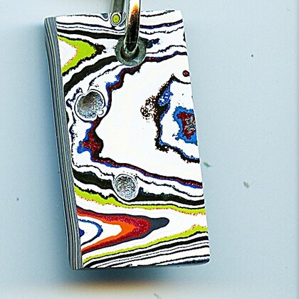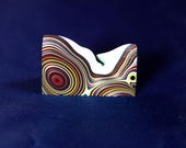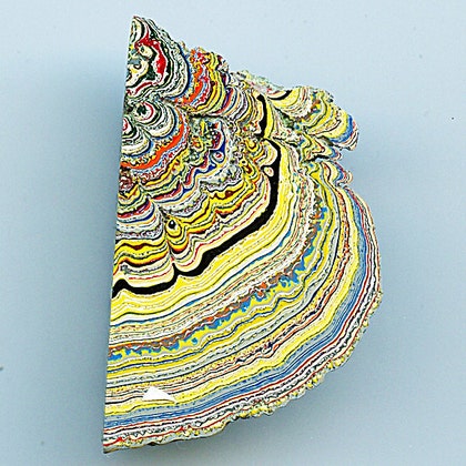 Fordite, is a unique automotive enamel material with an interesting history. The original layered automotive paint was made years ago, by the now extinct practice of hand spray-painting multiples of production cars in big automotive factories. The over sprayed paint in the painting bays gradually built up on the tracks that the car frames were painted on. Over time, many colorful layers built up on these tracks. These layers hardened repeatedly in the ovens that the car bodies went into to cure the paint. Eventually, the paint build-up would become obstructing, or too thick and heavy, and had to be removed. As the story goes, some crafty workers with an eye for beauty realized that this unique byproduct was worth salvaging and thus begun the era of Fordite.