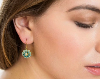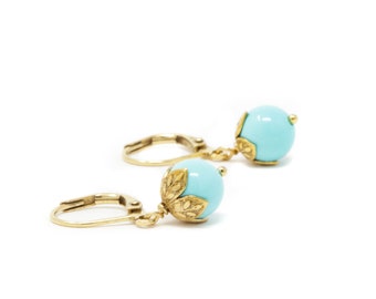 • Dainty Earrings - Aqua Pearl Drop Earrings - Gold Earrings - Leverback Earwires - Gift For Mom - Wedding Earrings