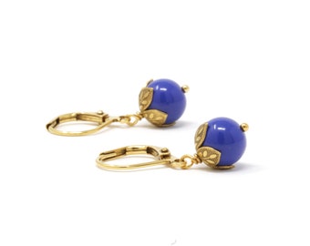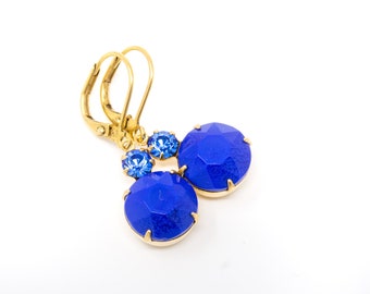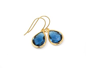 • Navy Blue Glass Jewel Earrings With Gold Ear Wires
