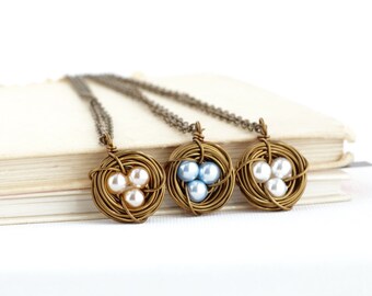 • Push Present - Gift For New Mom - Gift For Mother - Bird Nest Pendant - Family Jewelry - Pearl 3 Eggs in a Nest - Sweet Necklace