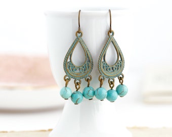 • Chandelier Earrings - Bohemian Earrings - Gypsy Earrings - Patina Earrings - Green Earrings - Turquoise Jewelry - Long Dangle Earrings