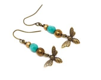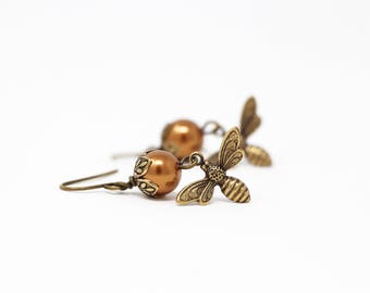 • Pearl Bee Earrings - Copper Pearl Earrings - Bumble Bee - Nature Jewelry - Dangle Earrings - Bee Jewelry - gift For Woman