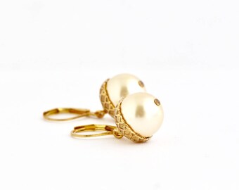 • Pearl Earrings - Acorn Earrings - Pale Gold Pearls - Dangle Earrings - Woodland Jewelry - Rustic Jewelry - Autumn Jewelry - Acorn Jewelry