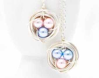 • Blue and Pink Eggs - Bird Nest Necklace - Push Present - Pearl Eggs - Silver Nest Necklace - Nest Necklace For Mother